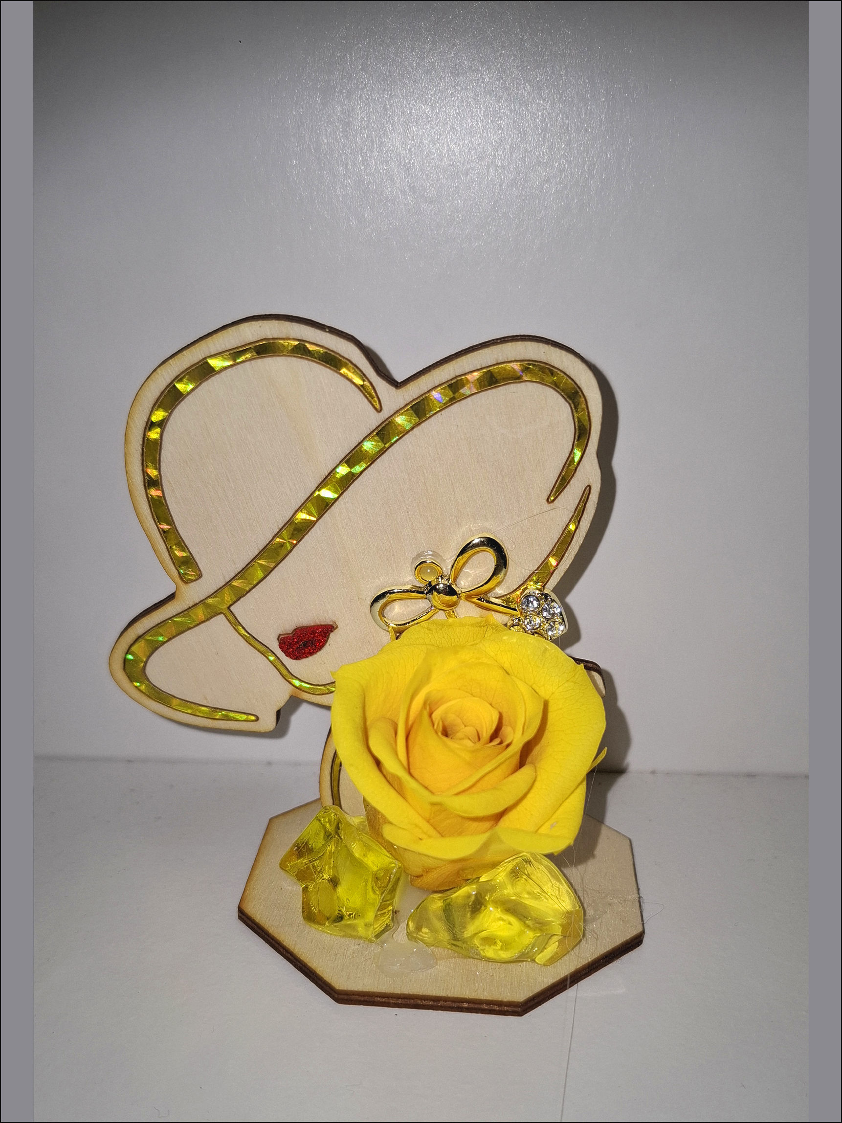 Base di legno con figura di donna e rosa stabilizzata d. 5,5 cm. Il prodotto è compreso di scatolina di plastica con base in cartoncino rigido 10x10x10 cm